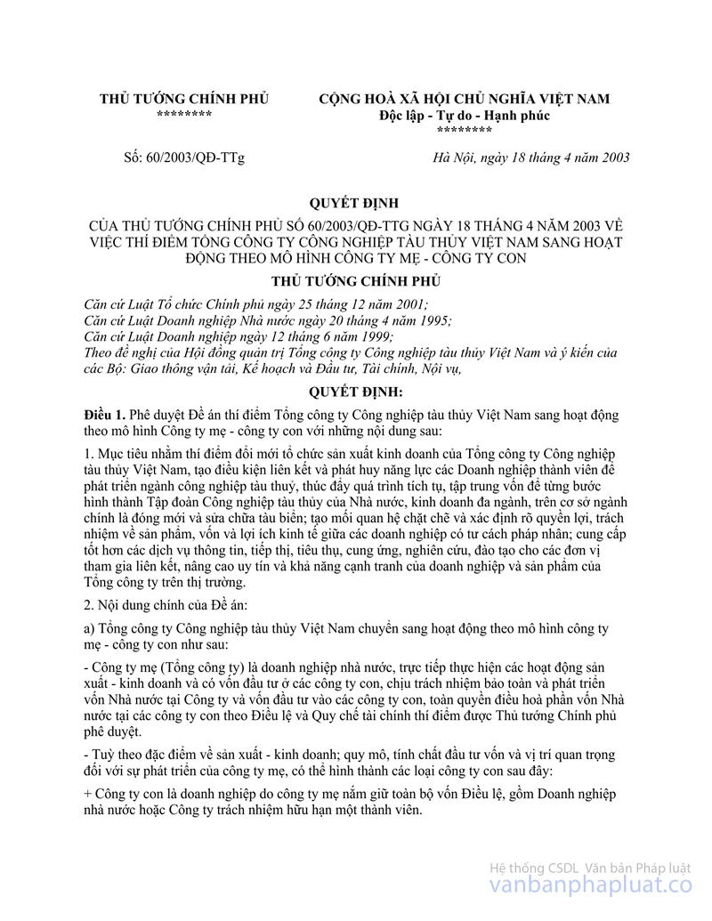 Nội dung toàn văn Decision No. 60/2003/QD-TTg of April 18, 2003, on the experimental transformation of Vietnam shipbuilding corporation to operate after the parent company-affiliate company model