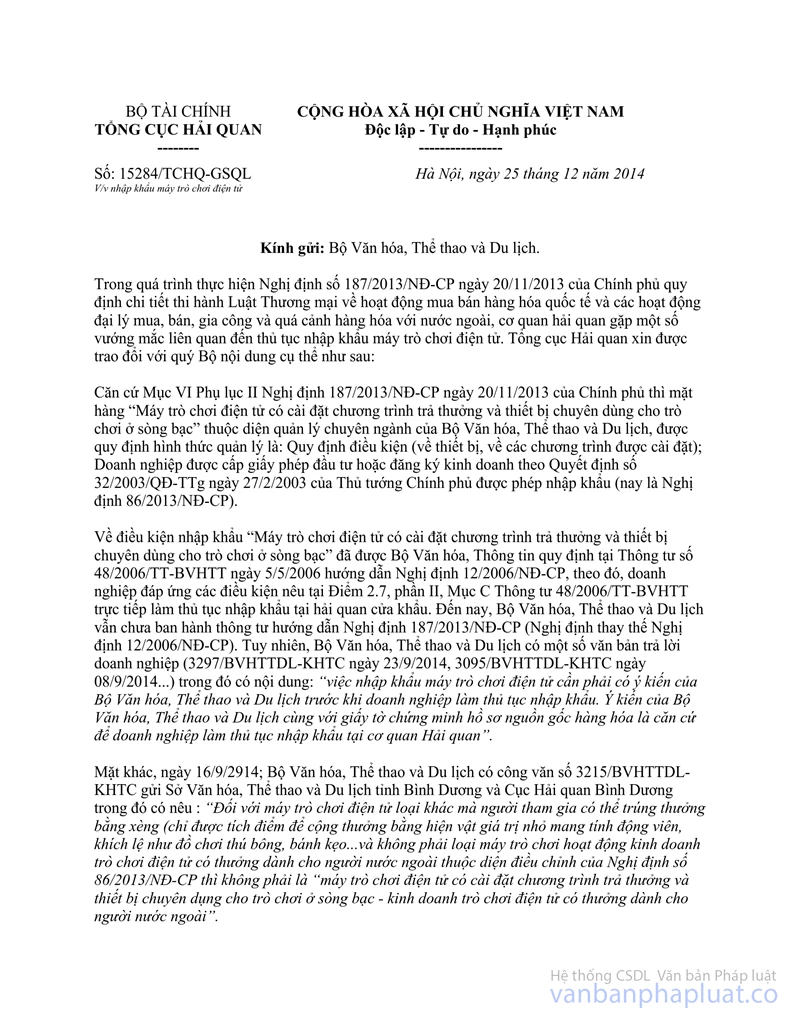 Ngày 25/12/2014, Tổng cục Hải quan có công văn số 15284/TCHQ-GSQL nêu vướng mắc và đề nghị Bộ Văn hóa, Thể thao và Du lịch làm rõ nội dung liên quan thủ tục và chính sách nhập khẩu mặt hàng máy trò chơi điện tử. Khi nhận được ý kiến của Bộ Văn hóa, Thể thao và Du lịch, Tổng cục Hải quan sẽ có công văn hướng dẫn các đơn vị thực hiện.