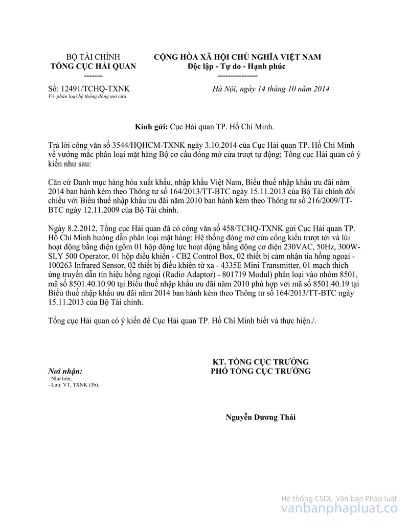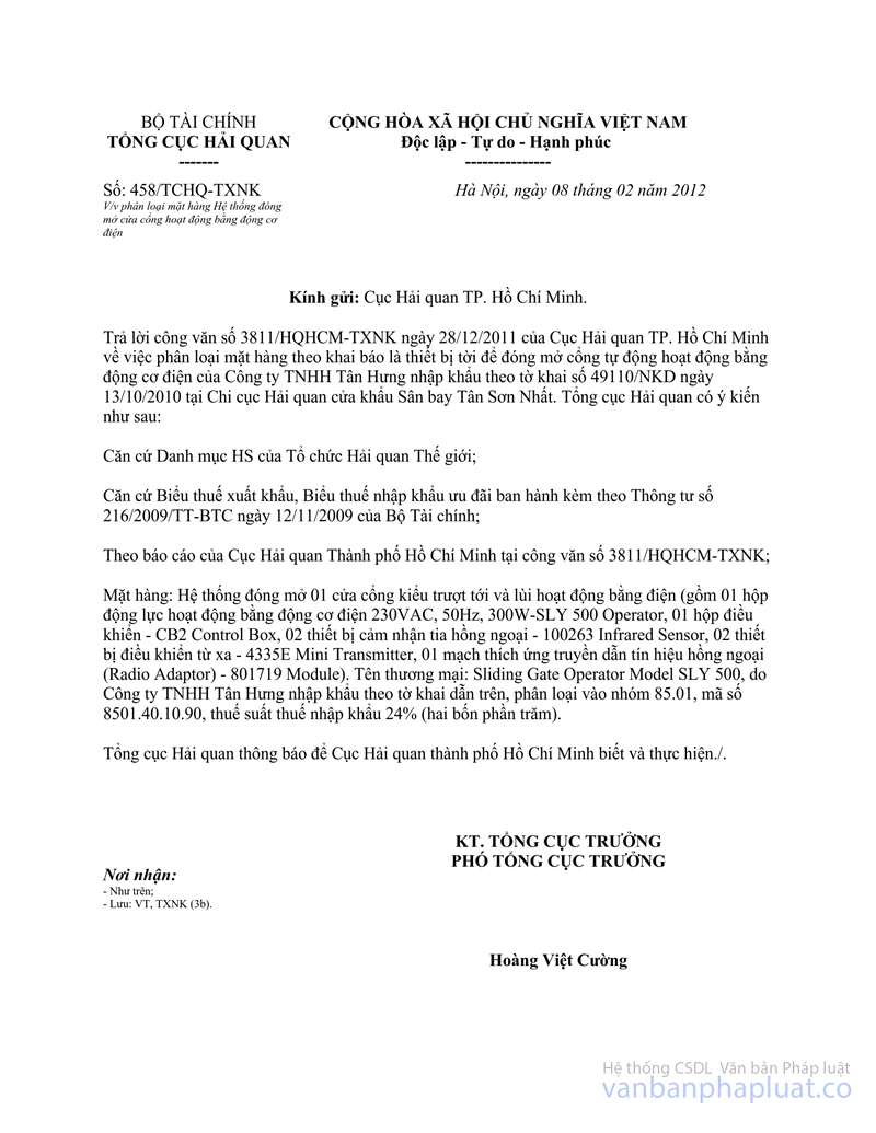 Ngày 8.2.2012, Tổng cục Hải quan đã có công văn số 458/TCHQ-TXNK hướng dẫn phân loại Hệ thống đóng mở cửa cổng kiểu trượt tới và lùi hoạt động bằng điện (gồm 01 hộp động lực hoạt động bằng động cơ điện 230VAC, 50Hz, 300W-SLY 500 Operator, 01 hộp điều khiển - CB2 Control Box, 02 thiết bị cảm nhận tia hồng ngoại - 100263 Infrared Sensor, 02 thiết bị điều khiển từ xa - 4335E Mini Transmitter, 01 mạch thích ứng truyền dẫn tín hiệu hồng ngoại (Radio Adaptor) - 801719 Modul) vào mã số 8501.40.10.90 (10 số) tại Biểu thuế nhập khẩu ưu đãi năm 2010 ban hành kèm theo Thông tư số 216/2009/TT-BTC ngày 12.11.2009 của Bộ Tài chính. Ngày 14.10.2014, Tổng cục Hải quan công văn số 12491/TCHQ-TXNK gửi Cục Hải quan TP. Hồ Chí Minh hướng dẫn phân loại mặt hàng hệ thống đóng mở cửa hoạt động bằng động cơ điện (xin gửi kèm bản photocopy để công ty biết).
