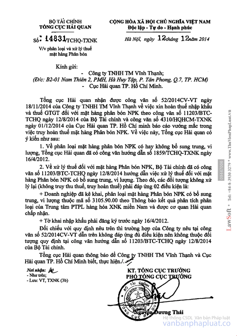 Ngày 12/12/2014, Tổng cục Hải quan đã có công văn số 14831/TCHQ-TXNK trả lời Công ty và Cục Hải quan TP. Hồ Chí Minh về việc phân loại và xử lý thuế đối với mặt hàng Phân bón do Công ty nhập khẩu.