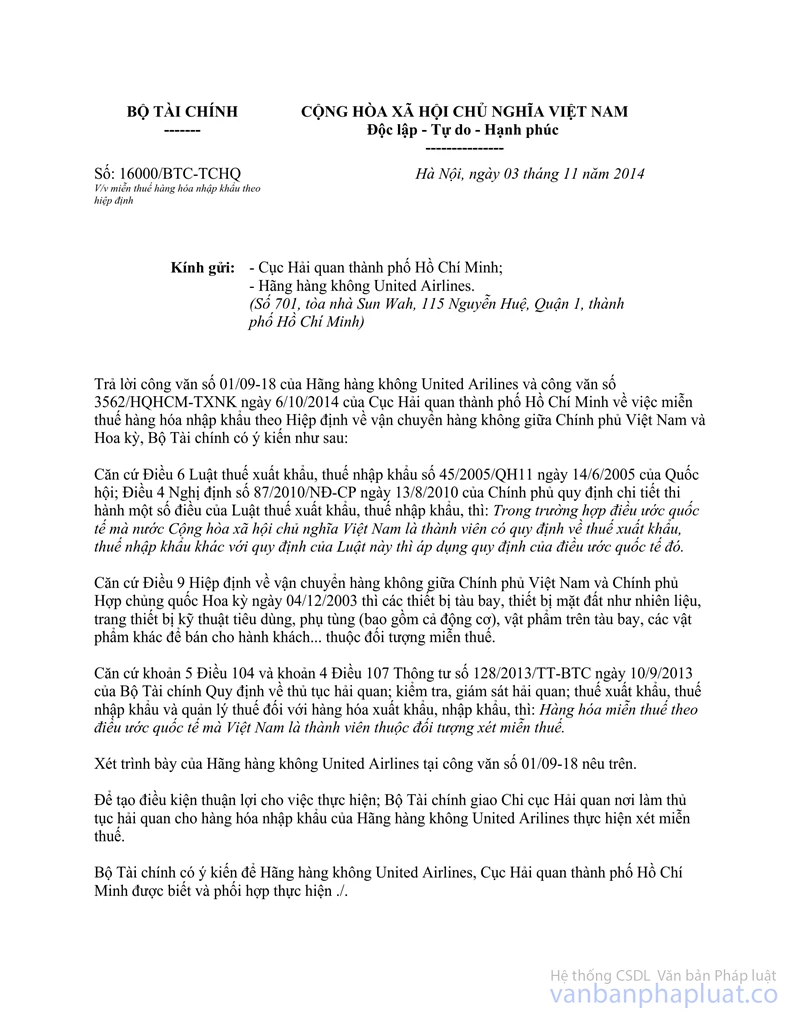 2. Về các vật dụng như sổ tay, lịch bàn, lịch treo tường bao thư có logo của hãng, thẻ lên máy bay, nhãn dán, đồ dùng trên máy bay... Bộ Tài chính đã có công văn số 16000/BTC-TCHQ ngày 03/11/2014 chỉ đạo Cục Hải quan thành phố Hồ Chí Minh thực hiện việc xét miễn thuế với nội dung giao Chi cục Hải quan nơi làm thủ tục hải quan thực hiện xét miễn thuế cho hàng hóa nhập khẩu của Hãng hàng không thuộc quốc gia có ký kết Hiệp định về vận chuyển hàng không với nước Cộng hòa Xã hội Chủ nghĩa Việt Nam.