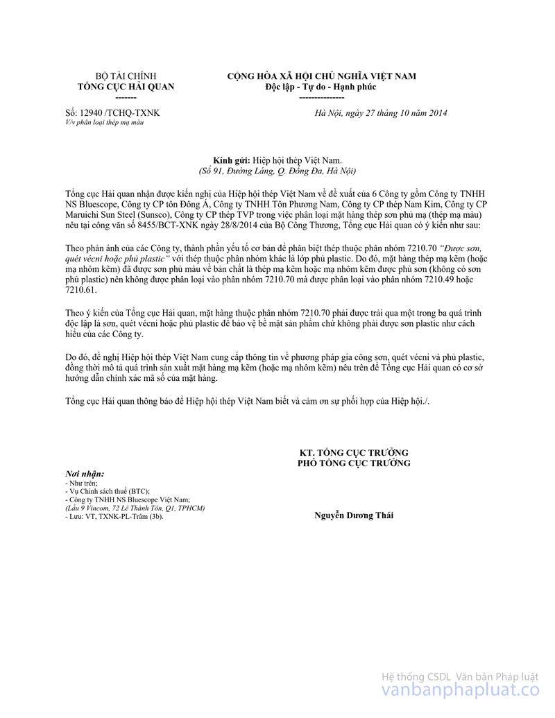 Ngày 27/10/2014, Tổng cục Hải quan có công văn số 12940/TCHQ-TXNK đề nghị Hiệp hội thép Việt Nam cung cấp thông tin về phương pháp gia công, quét vécni và phủ plastic, đồng thời mô tả quá trình sản xuất mặt hàng mạ kẽm (hoặc mạ nhôm kẽm) nêu trên để Tổng cục Hải quan có cơ sở hướng dẫn chính xác mã số của mặt hàng thép sơn phủ mạ (thép mạ màu) theo kiến nghị của Hiệp hội thép Việt Nam và Công ty TNHH NS Bluescope. Tuy nhiên, đến nay Tổng cục Hải quan chưa nhận được công văn trả lời.