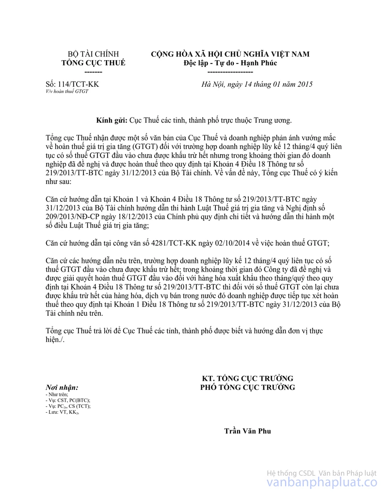 Căn cứ công văn số 114/TCT-KK ngày 14/01/2015 của Tổng cục Thuế về việc hoàn thuế GTGT;