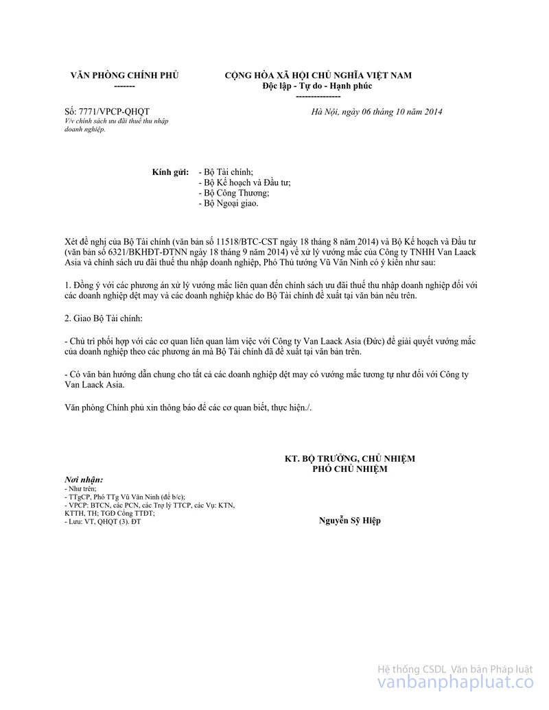 Ngày 18/8/2014, Bộ Tài chính có công văn số 11518/TCT-CST báo cáo Thủ tướng Chính phủ về chính sách ưu đãi thuế TNDN đối với Công ty TNHH Vanlaack Asia và các doanh nghiệp bị chấm dứt ưu đãi theo điều kiện tỷ lệ xuất khẩu của hoạt động dệt may theo cam kết WTO. Ngày 06/10/2014, Văn phòng Chính phủ có công văn số 7771/VPCP-QHQT gửi Bộ Tài chính, Bộ Kế hoạch và Đầu tư, Bộ Công Thương, Bộ Ngoại giao thông báo ý kiến của Phó Thủ tướng Vũ Văn Ninh về chính sách ưu đãi thuế TNDN theo đề xuất của Bộ Tài chính tại công văn số 11518/TCT-CST ngày 18/8/2014.