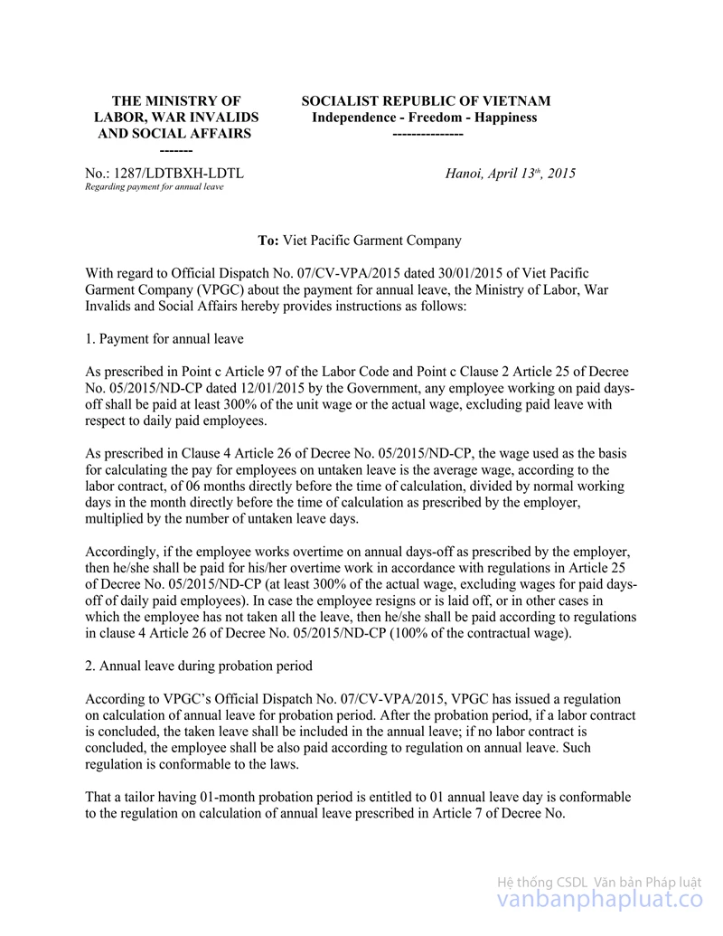 Theo công văn số 07/CV-VPA/2015 của quý Công ty thì Công ty đã quy định tính ngày nghỉ hằng năm tương ứng cho thời gian thử việc. Sau thời gian thử việc, nếu ký hợp đồng lao động thì tính vào ngày nghỉ hằng năm, nếu không ký hợp đồng lao động thì thanh toán tiền ngày nghỉ hằng năm tương ứng. Việc quy định như vậy là không trái với quy định của pháp luật.
