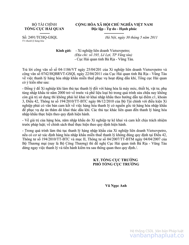 Tổng cục Hải quan thông báo để Cục Hải quan tỉnh Bà Rịa-Vũng Tàu, Liên doanh Việt - Nga Vietsovpetro được biết và thực hiện.