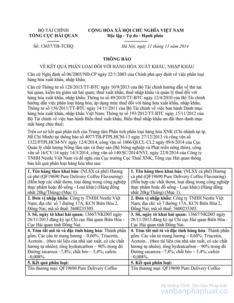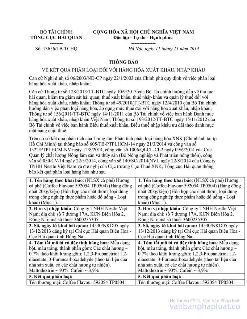 1. Mặt hàng Hương cà phê 592054 và mặt hàng Hương cà phê QF19690 đã được phân loại thuộc mã số 2101.12.90 tại Thông báo kết quả phân loại số 13656/TB-TCHQ và số 13657/TB-TCHQ ngày 11/11/2014 căn cứ trên kết quả phân tích và tài liệu của nhà sản xuất do Công ty cung cấp. Theo đó, mặt hàng là hương cà phê trong thành phần có chứa caffein và tài liệu kỹ thuật thể hiện trong thành phần có các chất hương tự nhiên.