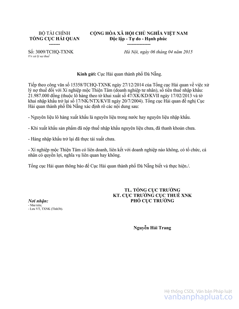 Tổng cục Hải quan thông báo để Cục Hải quan thành phố Đà Nẵng biết và thực hiện./.