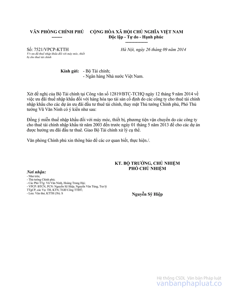Để thống nhất trong việc xử lý thuế nhập khẩu đối với hàng hóa là máy móc, thiết bị, phương tiện vận chuyển của các Công ty cho thuê tài chính nhập khẩu để cho các dự án ưu đãi đầu tư thuê tài chính, căn cứ Luật Thuế xuất khẩu, thuế nhập khẩu số 45/2005/QH11, Nghị định số 16/2001/NĐ-CP ngày 02/5/2001 của Chính phủ, công văn số 7521/VPCP-KTTH ngày 26/9/2014 của Văn phòng Chính phủ thông báo ý kiến của Phó Thủ tướng Vũ Văn Ninh về việc ưu đãi thuế nhập khẩu đối với máy móc, thiết bị cho thuê tài chính, Bộ Tài chính hướng dẫn về chính sách thuế đối với các Công ty cho thuê tài chính như sau: