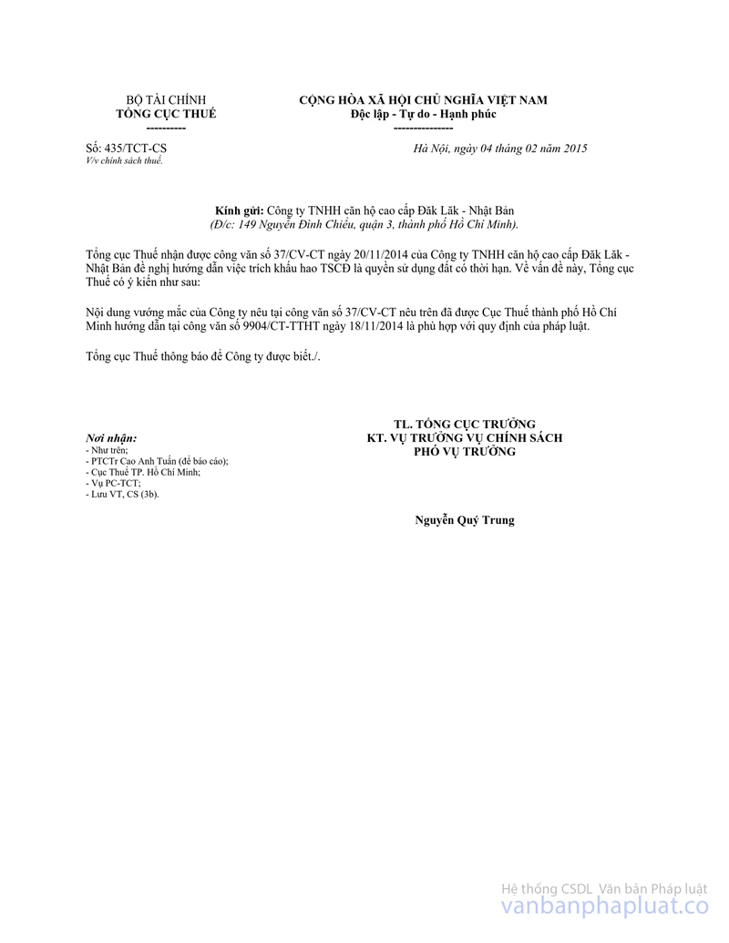 Tổng cục Thuế nhận được công văn số 06/CV-CT ngày 11/02/2015 của Công ty TNHH căn hộ cao cấp Đăk Lăk - Nhật Bản đề nghị hướng dẫn việc trích khấu hao TSCĐ là quyền sử dụng đất có thời hạn. Về vấn đề này, Tổng cục Thuế có ý kiến như sau: