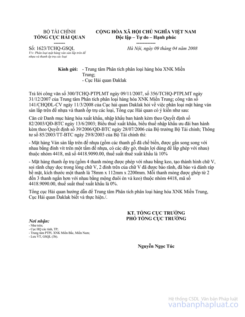Trả lời công văn số 4439/HQHP-NV ngày 16/04/2008 của Cục hải quan Hải Phòng về vướng mắc khi thực hiện công văn số 1623/TCHQ-GSQL ngày 09/04/2008 hướng phân loại mặt hàng ván sàn lắp trên đế nhựa và thanh ốp trụ các loại, Tổng cục Hải quan có ý kiến như sau: