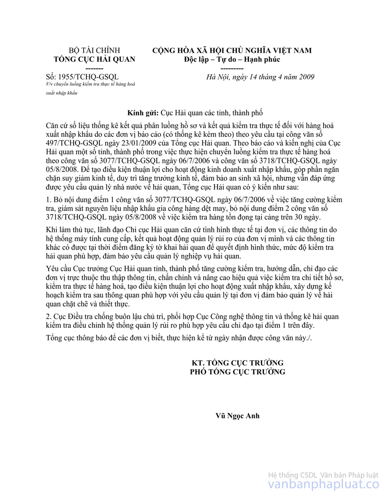 - Ngày 14/04/2009, Tổng cục Hải quan có công văn số 1955/TCHQ-GSQL chấn chỉnh việc phân luồng, tạo thuận lợi cho hoạt động XNK.