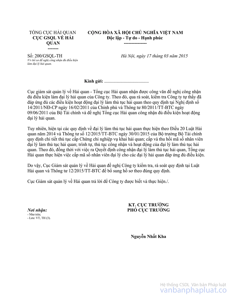 Ngày 17/03/2015, Cục Giám sát quản lý đã có công văn số 200/GSQL- TH v/v đề nghị bổ sung bộ hồ sơ công nhận đủ điều kiện hoạt động đại lý đối với 05 trường hợp do Cục Hải quan TP. Hà Nội tiếp nhận và chuyển về Tổng cục Hải quan.