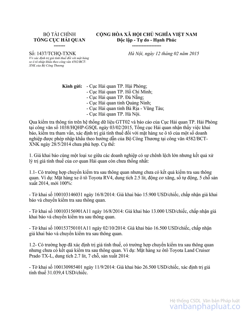 2. Căn cứ các quy định, để tránh việc doanh nghiệp khai báo giá thấp đã được thông quan nhưng chậm được xử lý sau khi hàng hóa đã thông quan, Tổng cục Hải quan đã có công văn số 1437/TCHQ-TXNK ngày 12/02/2015 đôn đốc, chỉ đạo cục hải quan địa phương liên quan thực hiện kịp thời các bước công việc cần thiết để xác định trị giá tính thuế đối với mặt hàng xe ôtô nhập khẩu đúng quy định. Đây là công việc thường xuyên của Tổng cục Hải quan nhằm xác định đúng trị giá thực thanh toán, tránh việc lợi dụng các quy định về tạo thuận lợi trong thông quan hàng hóa để gian lận trốn thuế.