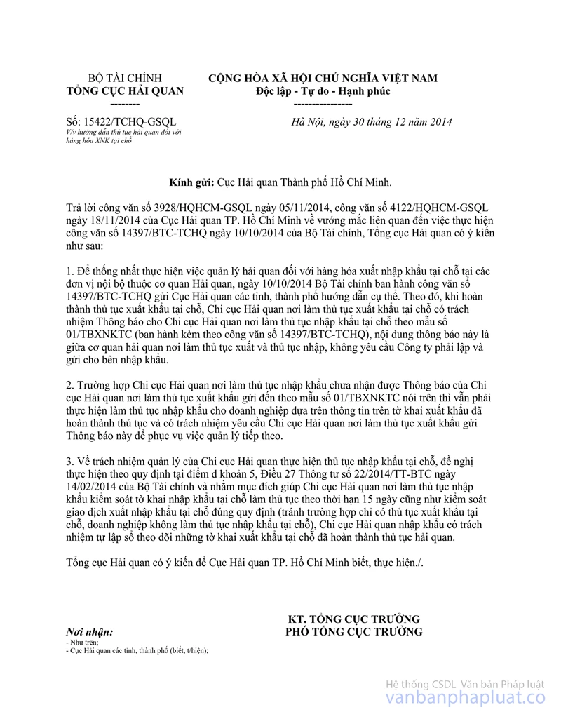 Ngày 30/12/2014, Tổng cục Hải quan có công văn số 15422/TCHQ-GSQL hướng dẫn Cục Hải quan các tỉnh, thành phố thống nhất thực hiện việc làm thủ tục hải quan đối với hàng hóa xuất nhập khẩu tại chỗ. Theo đó, tại điểm 2 công văn hướng dẫn cụ thể việc thực hiện thông báo hoàn thành thủ tục hải quan đối với hàng hóa xuất nhập khẩu tại chỗ độc lập với quy trình thực hiện thủ tục hải quan đối với hàng hóa xuất nhập khẩu tại chỗ. Do vậy, đề nghị Cục Hải quan tỉnh Bắc Ninh vẫn thực hiện việc hoàn thành thông báo theo mẫu số 29/TBXNKTC/2013 ban hành kèm theo Thông tư số 128/2013/TT-BTC và mẫu số 01/TBXNKTC kèm theo công văn số 14397/BTC-TCHQ có đầy đủ dấu của Chi cục theo quy định.