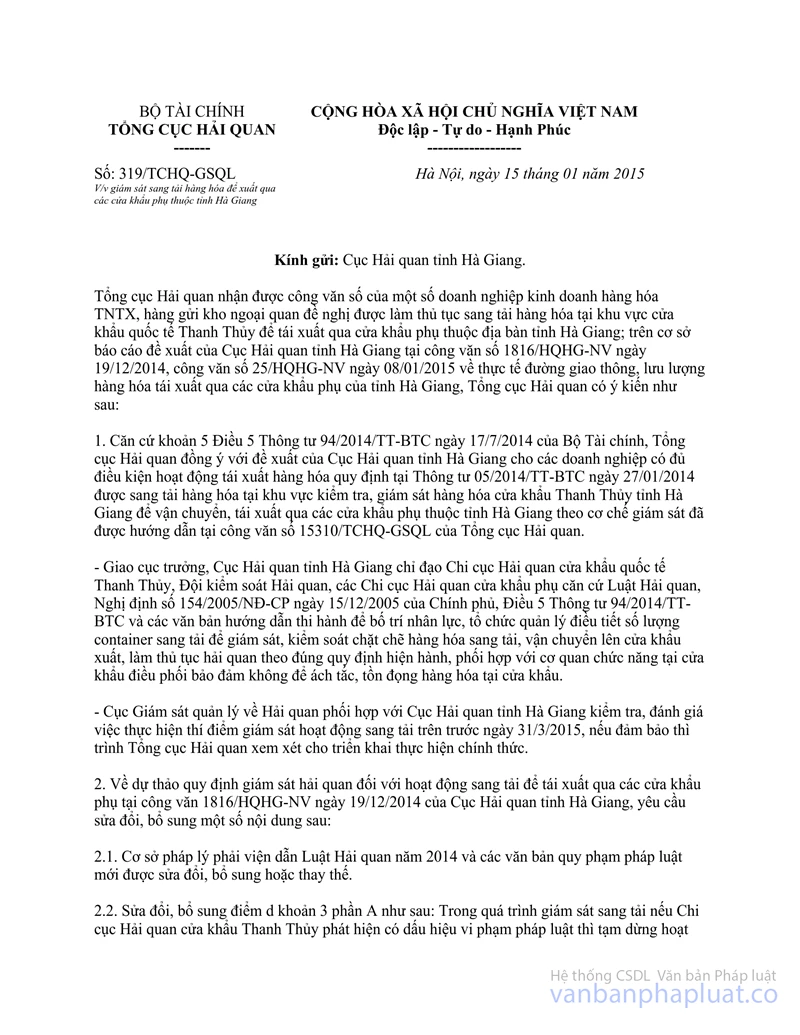 Trả lời công văn số 297/HQHG-NV ngày 17/3/2015 và các công văn số 80/HQHG-NV ngày 16/01/2015, số 126/HQHG-NV ngày 27/01/2015, số 133/HQHG-NV ngày 30/01/2015 của Cục Hải quan tỉnh Hà Giang về việc nêu tại trích yếu; Tiếp theo công văn số 319/TCHQ-GSQL ngày 15/01/2015 về việc giám sát sang tải hàng hóa, Tổng cục Hải quan có ý kiến như sau: