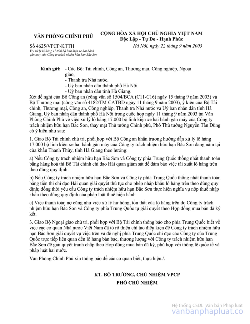Bộ Khoa học và Công nghệ đã nhận được công văn số 176/CVBS-04 ngày 23 tháng 9 năm 2004 của Quý Công ty về việc nhập khẩu phụ tùng xe máy đang tồn đọng tại cửa khẩu theo sự cho phép của Thủ tướng Chính phủ tại công văn số 4625/VPCP-KTTH ngày 22 tháng 9 năm 2003.