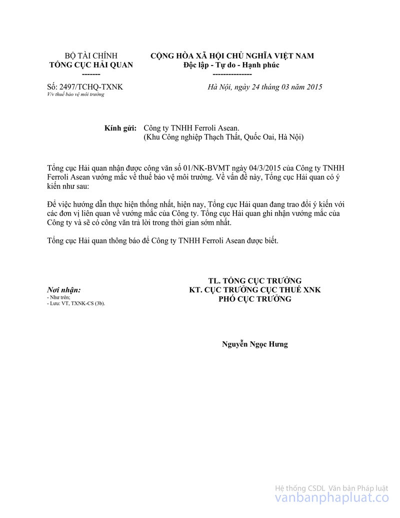 Tổng cục Hải quan nhận được công văn số 01/NK-BVMT ngày 04/3/2015 của Công ty TNHH Ferroli Asean vướng mắc về thuế bảo vệ môi trường. Về vấn đề này, tiếp theo công văn số 2497/TCHQ-TXNK ngày 24/03/2015, Tổng cục Hải quan có ý kiến như sau: