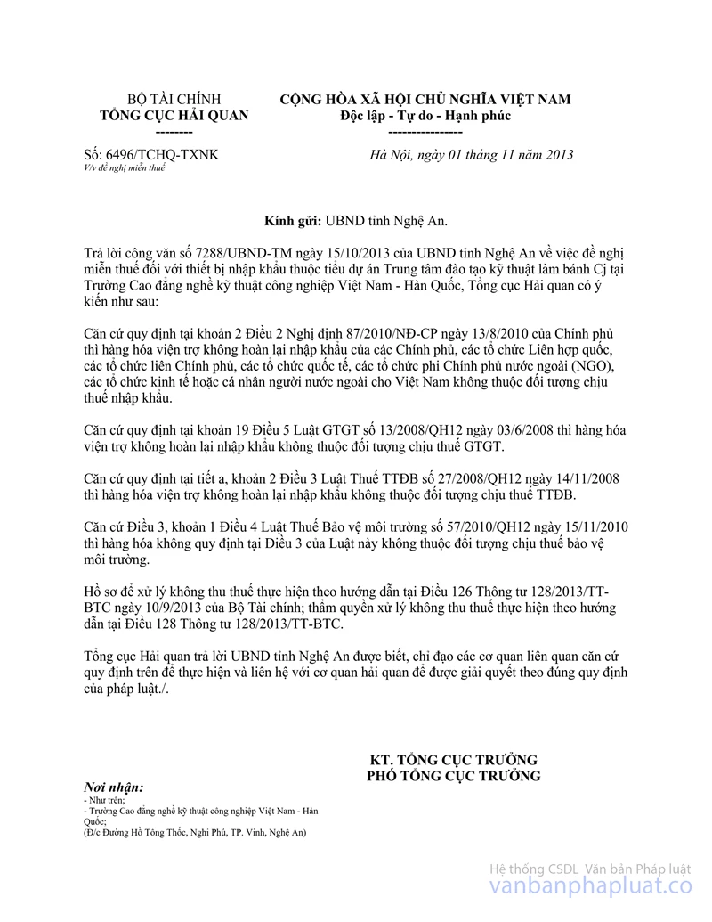 1. Về việc Uỷ ban nhân dân tỉnh Nghệ An đề nghị miễn thuế nhập khẩu đối với thiết bị nhập khẩu thuộc tiểu dự án Trung tâm đào tạo kỹ thuật làm bánh Cj tại Trường Cao đẳng nghề Kỹ thuật Công nghiệp Việt Nam - Hàn Quốc, ngày 01/11/2013 Tổng cục Hải quan đã có công văn số 6496/TCHQ-TXNK trả lời Uỷ ban nhân dân tỉnh Nghệ An.