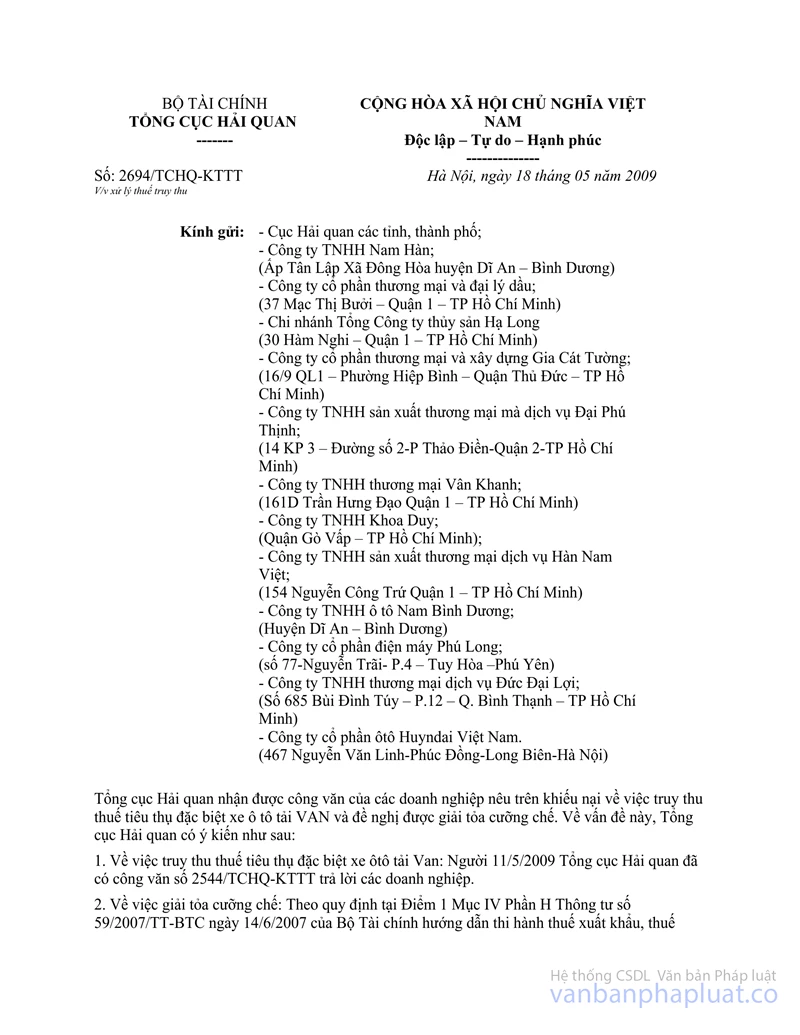 Ngày 18/5/2009, Tổng cục Hải quan đã có công văn số 2694/TCHQ-KTTT gửi Cục Hải quan các tỉnh, thành phố hướng dẫn về việc truy thu thuế tiêu thụ đặc biệt xe ô tô tải VAN trong đó hướng dẫn cụ thể xử lý tiền phạt chậm nộp thuế. Do đó, đề nghị Cục Hải quan thành phố Hồ Chí Minh thực hiện theo hướng dẫn tại công văn 2694/TCHQ-KTTT nêu trên.
