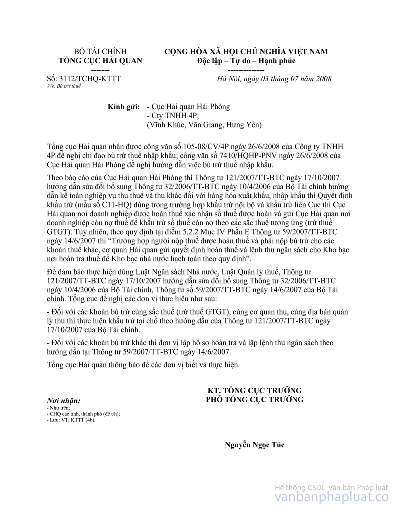Căn cứ khoản 2 Điều 22 Nghị định số 85/2007/NĐ-CP ngày 25/05/2007 quy định chi tiết thi hành một số điều của Luật Quản lý thuế thì: Người nộp thuế có quyền yêu cầu cơ quan quản lý thuế giải quyết số tiền thuế nộp thừa bằng cách bù trừ số tiền thuế nộp thừa với số tiền thuế, tiền phạt còn nợ, kể cả việc bù trừ giữa các sắc thuế với nhau. Do đó, nếu Doanh nghiệp có nợ thuế của tờ khai số 3752/NKD ngày 31/03/2008 tại Chi cục Hải quan hàng Đầu tư gia công - Cục Hải quan Hải Phòng và đã có văn bản yêu cầu cơ quan Hải quan bù trừ giữa số thuế được hoàn với số thuế phải nộp cho tờ khai số 3572/NKD trong thời hạn nộp thuế, nhưng do chưa hoàn tất thủ tục bù trừ nên các tờ khai nhập khẩu tiếp theo không được áp dụng thời hạn nộp thuế của đối tượng chấp hành tốt pháp luật về thuế thì Doanh nghiệp được ân hạn thuế với điều kiện ngoài số nợ thuế của tờ khai 3572/NKD nêu trên, Doanh nghiệp không có nợ thuế quá hạn, nợ phạt của các lô hàng khác, đồng thời đáp ứng các tiêu chí quy định tại điểm 2.1 Phần A Thông tư số 112/TT-BTC ngày 15/12/2005 của Bộ Tài chính. Yêu cầu Cục Hải quan Tp Hồ Chí Minh khẩn trương hoàn tất việc bù trừ thuế cho Doanh nghiệp theo hướng dẫn tại công văn số 3112/TCHQ-KTTT ngày 03/07/2008 của Tổng cục Hải quan.