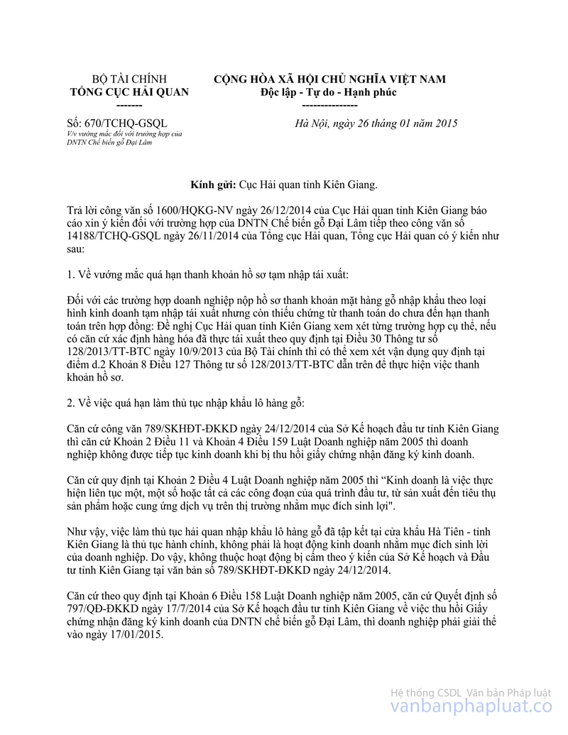 Trả lời công văn số 134/HQKG-NV ngày 03/02/2015 của Cục Hải quan tỉnh Kiên Giang xin ý kiến về trường hợp của DNTN chế biến gỗ Đại Lâm theo hướng dẫn của Tổng cục Hải quan tại công văn số 670/TCHQ-GSQL ngày 26/01/2015, Tổng cục Hải quan có ý kiến như sau: