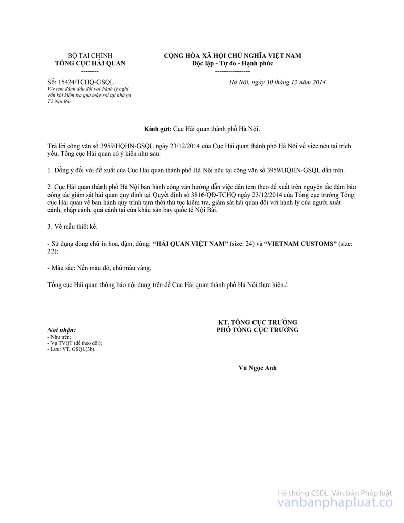 2. Về mẫu tem: Cục Hải quan thành phố Hà Nội căn cứ theo hướng dẫn tại công văn số 15424/TCHQ-GSQL ngày 30/12/2014 của Tổng cục Hải quan để in ấn.