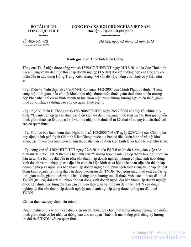 Về vấn đề ưu đãi thuế thu nhập doanh nghiệp của Công ty cổ phần đầu tư xây dựng Hồng Trung - Kiên Giang, Tổng cục Thuế đã có công văn số 405/TCT-CS ngày 2/2/2015 trả lời Cục Thuế tỉnh Kiên giang.