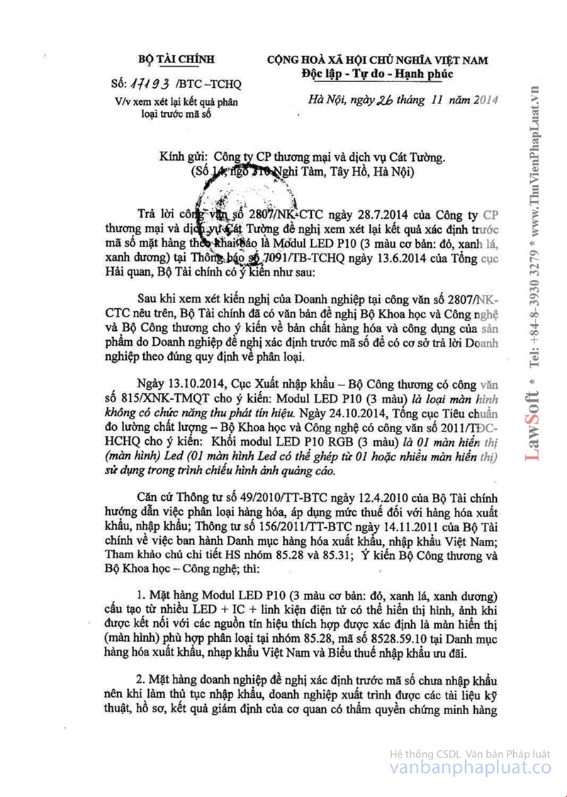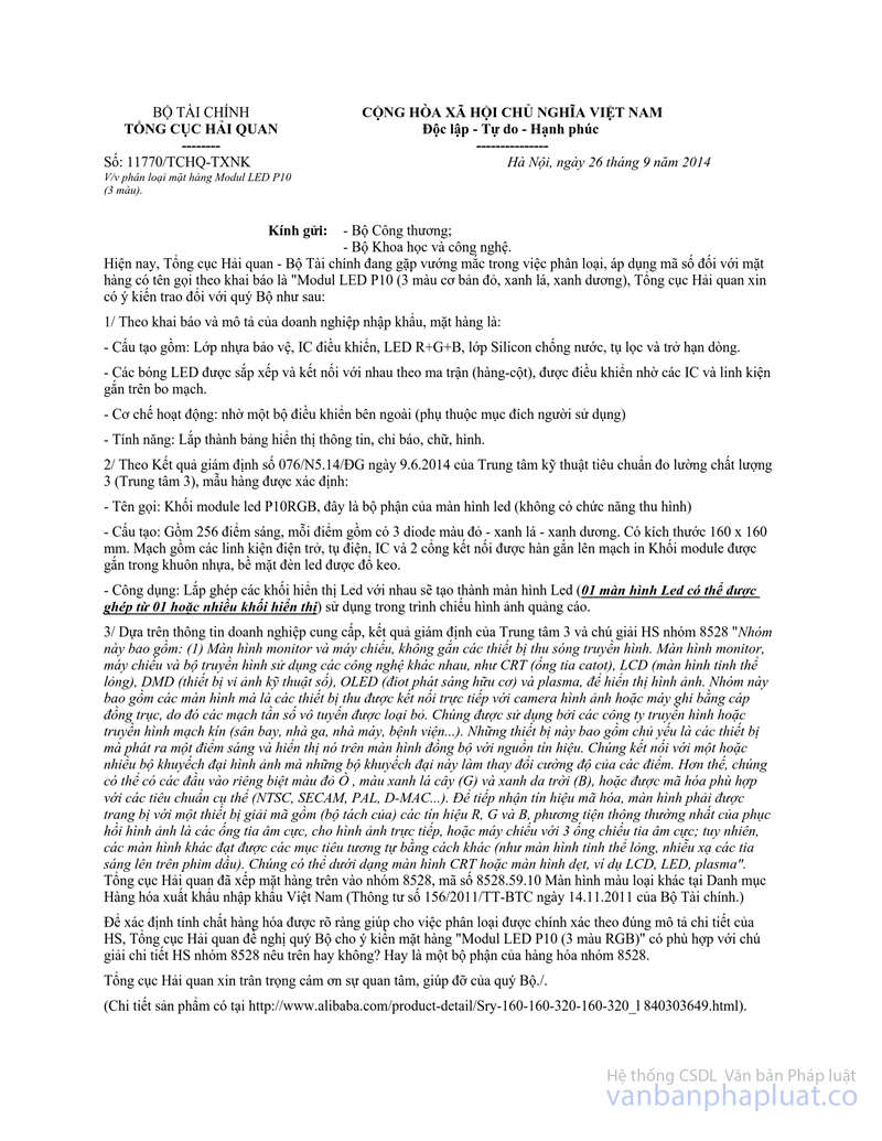 Trên cơ sở các ý kiến của Quý Bộ, ngày 26.11.2014, Bộ Tài chính đã ban hành công văn số 17193/BTC-TCHQ hướng dẫn phân loại Mặt hàng Modul LED P10 (3 màu cơ bản: đỏ, xanh lá, xanh dương) cấu tạo từ nhiều LED + IC + linh kiện điện tử có thể hiển thị hình, ảnh khi được kết nối với các nguồn tín hiệu thích hợp được xác định là màn hiển thị (màn hình) phù hợp phân loại tại nhóm 85.28: “Màn hình và máy chiếu, không gắn với máy thu dùng trong truyền hình; máy thu dùng trong truyền hình, có hoặc không gắn với máy thu thanh sóng vô tuyến hoặc máy ghi âm hoặc tái tạo âm thanh hoặc hình ảnh”, phân nhóm 1 gạch “- Màn hình khác”, phân nhóm 8528.59: “- - Loại khác”, mã số 8528.59.10: “- - - Loại màu”.