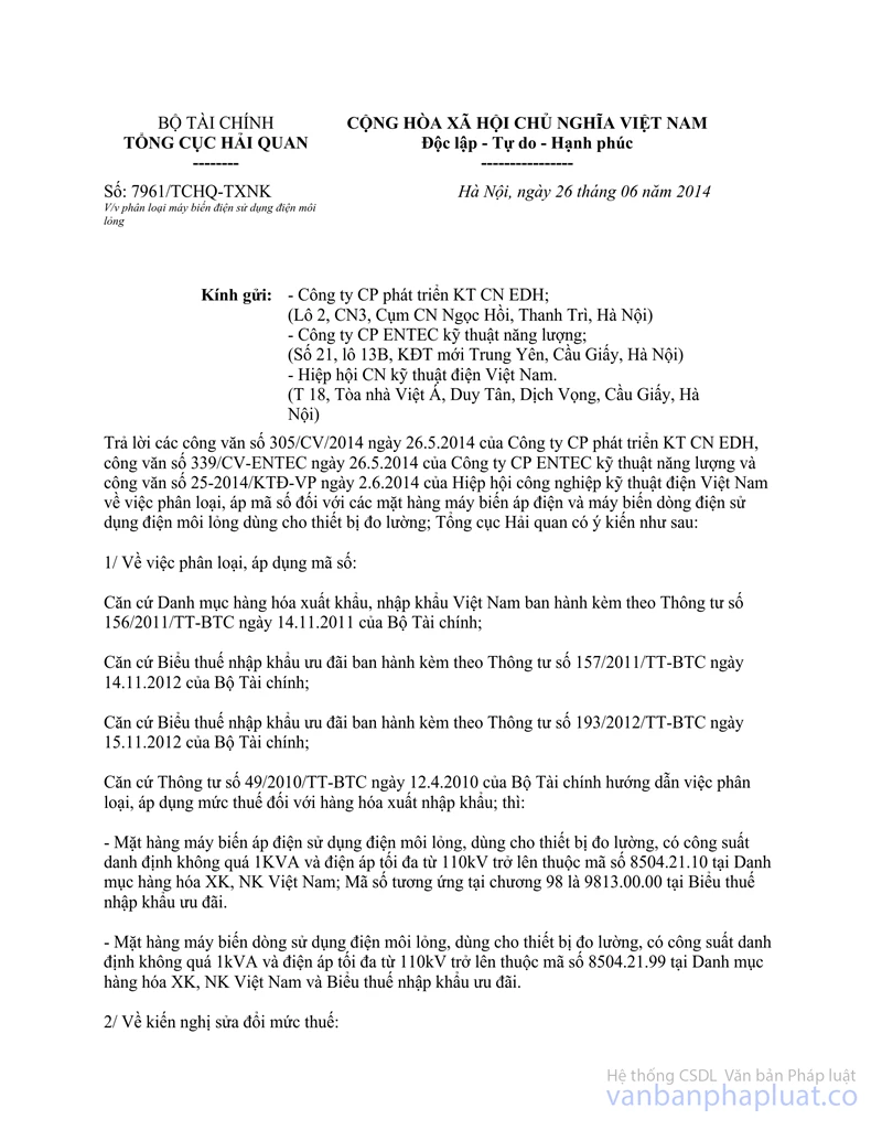 Trả lời công văn số 170/CV-ENTEC ngày 13/4/2015 của Công ty Cổ phần Entec Kỹ thuật năng lượng (Công ty) kiến nghị vướng mắc về thuế nhập khẩu mặt hàng máy biến dòng, máy biến điện áp đo lường, Tổng cục Hải quan có ý kiến như sau:
