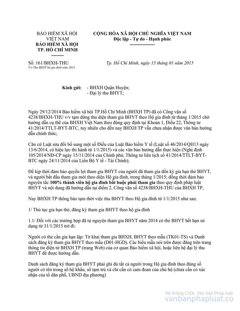 Tiếp theo công văn số 161/BHXH-THU ngày 15 tháng 01 năm 2015 của Bảo hiểm xã hội Thành phố Hồ Chí Minh (BHXH TP) về việc thu BHYT hộ gia đình, BHXH TP hướng dẫn bổ sung nhằm tạm thời giải quyết một số vướng mắc phát sinh trong quá trình thực hiện liên quan đến hồ sơ, thủ tục tham gia BHYT hộ gia đình trên địa bàn thành phố như sau:
