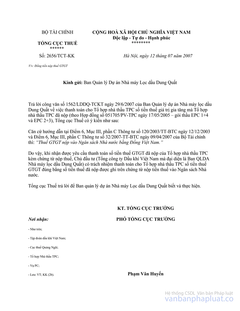 Tổng cục Thuế trả lời để Ban Quản lý dự án Nhà máy lọc dầu Dung Quất được biết và thực hiện.