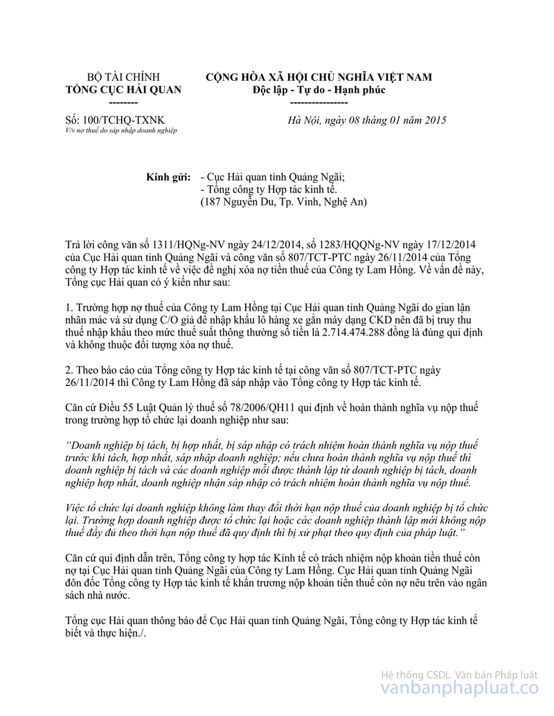 1. Về việc sáp nhập Công ty Lam Hồng vào Tổng công ty Hợp tác kinh tế: Tổng cục Hải quan đã có công văn số 100/TCHQ-TXNK ngày 08/01/2015 và công văn số 56/TCHQ-TXNK ngày 07/01/2015 trả lời Tổng công ty hợp tác kinh tế, Cục Hải quan Quảng Ngãi và Cục Hải quan Bình Định. Theo đó, căn cứ Điều 55 Luật Quản lý thuế số 78/2006/QH11 thì doanh nghiệp nhận sáp nhập là Tổng công ty hợp tác kinh tế có trách nhiệm thanh toán các khoản nợ của Công ty Lam Hồng là doanh nghiệp bị sáp nhập.