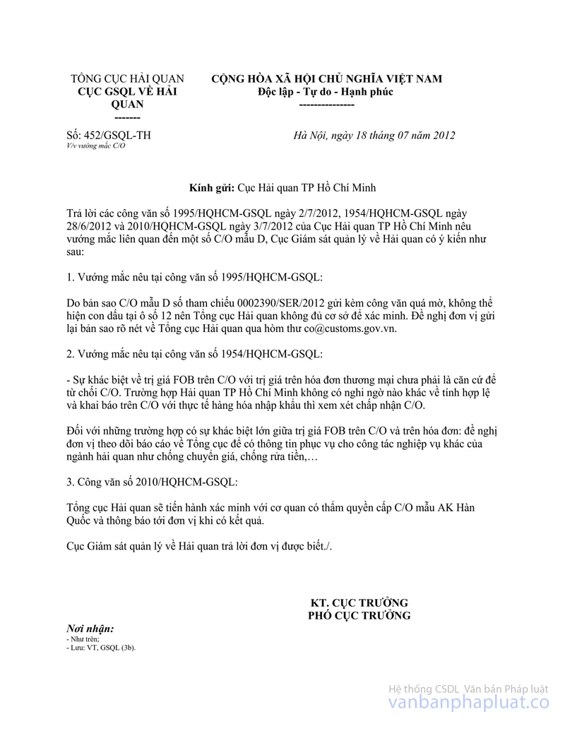 - Các trường hợp khác biệt trị giá trên C/O và chứng từ khác, đề nghị đơn vị thực hiện theo hướng dẫn tại công văn số 452/GSQL-TH ngày 18/7/2012.