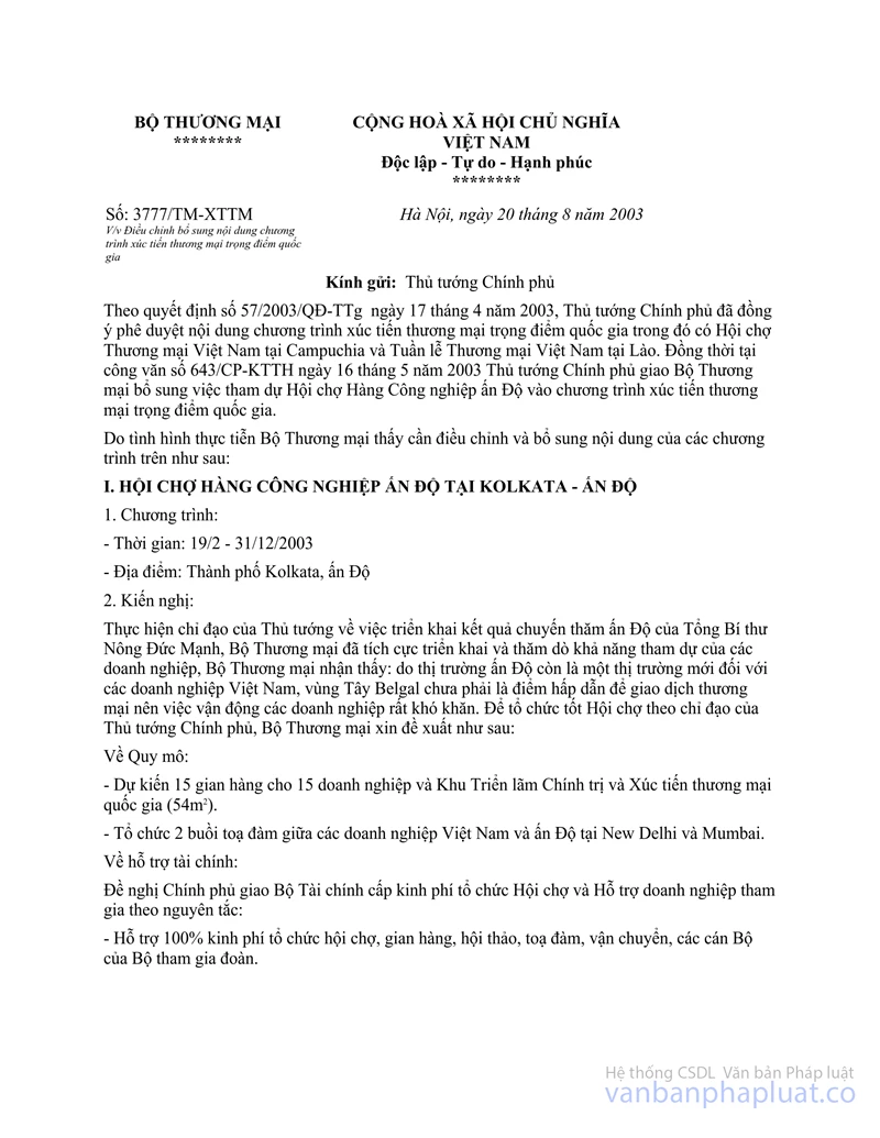 Xét đề nghị của Bộ Thương mại tại công văn số 3777/TM-XTTM ngày 20 tháng 8 năm 2003 về việc bổ sung, Điều chỉnh Chương trình xúc tiến thương mại tại Quyết định số 57/2003/QĐ-TTg ngày 17 tháng 4 năm 2003 của Thủ tướng Chính phủ, Phó Thủ tướng Vũ Khoan thay mặt Chính phủ có ý kiến như sau: