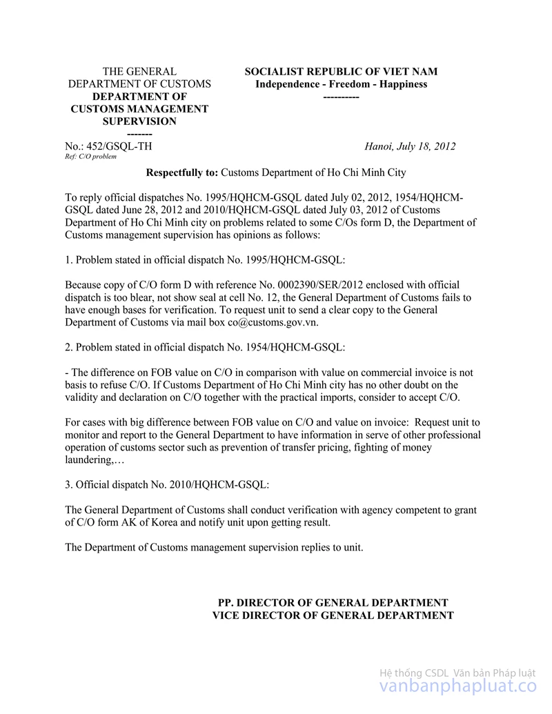 Nội dung toàn văn Công văn 452/GSQL-TH vướng mắc C/O