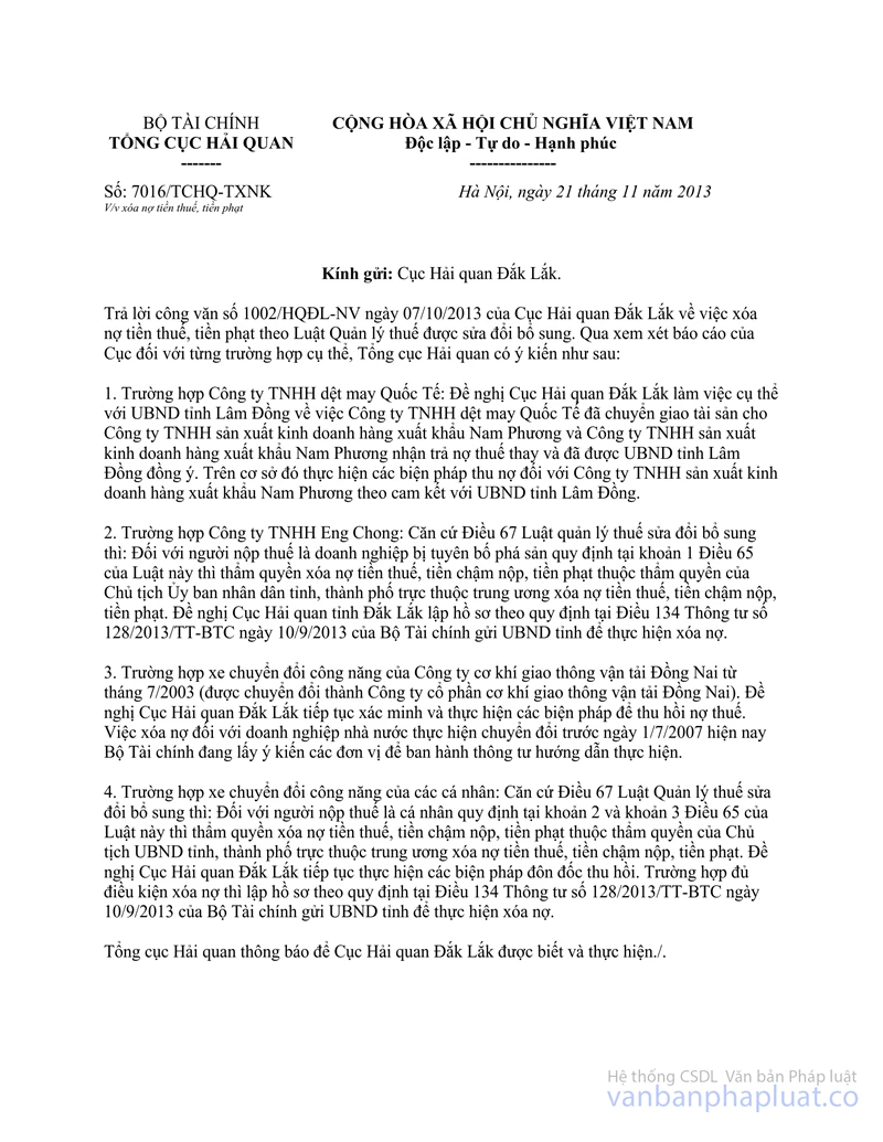 1. Đối với khoản nợ thuế của Công ty TNHH dệt may Quốc tế: Theo báo cáo của đơn vị thì ngày 14/11/2002 UBND tỉnh Lâm Đồng đã có công văn số 3802/UB đồng ý cho phép Công ty TNHH sản xuất kinh doanh hàng xuất khẩu Nam Phương di dời tài sản của Công ty TNHH dệt may Quốc tế về Công ty TNHH sản xuất kinh doanh hàng xuất khẩu Nam Phương với điều kiện Công ty TNHH sản xuất kinh doanh hàng xuất khẩu Nam Phương phải cam kết trả nợ thay cho Công ty TNHH dệt may Quốc tế. Vì vậy, theo điểm 1 công văn số 7016/TCHQ-TXNK ngày 21/11/2013 của Tổng cục Hải quan, Công ty TNHH sản xuất kinh doanh hàng xuất khẩu Nam Phương có trách nhiệm thanh toán khoản nợ thuế của Công ty TNHH dệt may Quốc tế theo cam kết. Đề nghị Cục Hải quan tỉnh Đắc Lắk kịp thời đôn đốc và thực hiện các biện pháp thu hồi nợ thuế theo quy định.