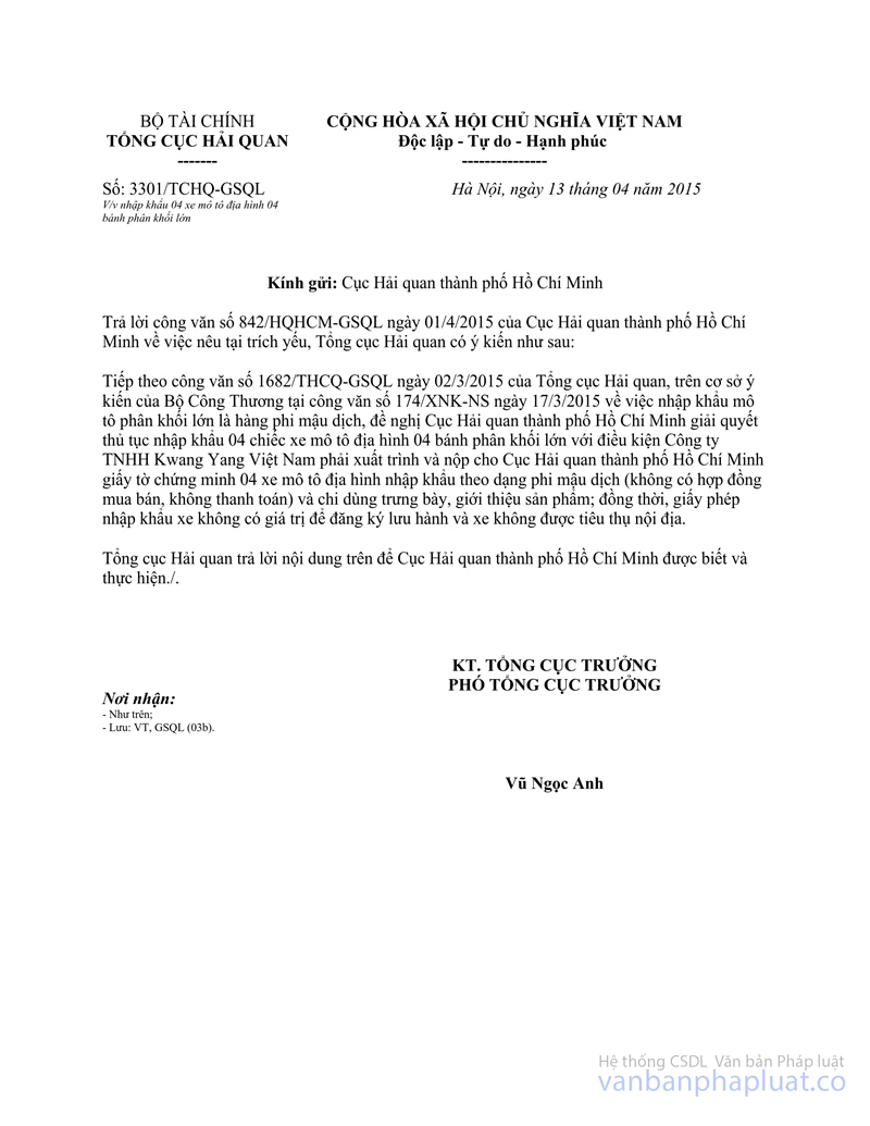 Tổng cục Hải quan trả lời để Cục Hải quan TP Hồ Chí Minh thực hiện./