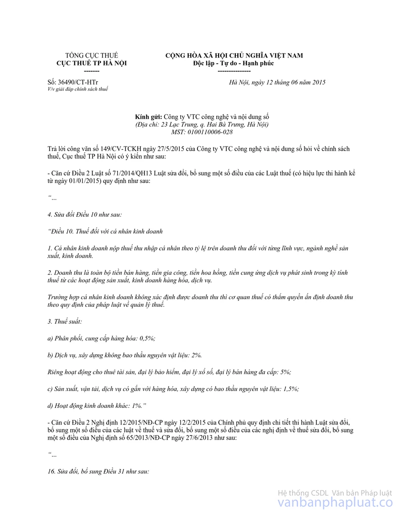 Cục thuế TP Hà Nội trả lời để Công ty VTC công nghệ và nội dung số được biết và thực hiện./.