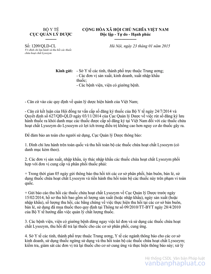 Căn cứ kết luận của Hội đồng tư vấn cấp số đăng ký thuốc của Bộ Y tế ngày 24/7/2014 và Quyết định số 627/QĐ-QLD ngày 03/11/2014 của Cục Quản lý Dược về việc rút số đăng ký lưu hành thuốc ra khỏi danh mục các thuốc được cấp số đăng ký tại Việt Nam đối với các thuốc chứa hoạt chất Lysozym, ngày 23/01/2015, Cục Quản lý Dược đã có công văn số 1209/QLD-CL về việc đình chỉ lưu hành và thu hồi các thuốc chứa hoạt chất Lysozym theo danh mục đính kèm.