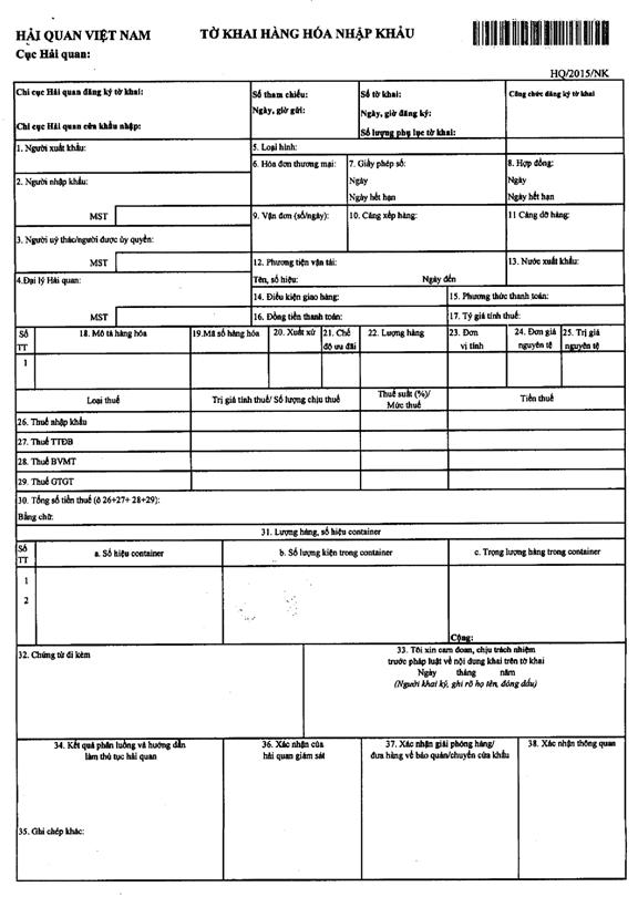 Các trường hợp nhập khẩu, tạm nhập khẩu của các đối tượng ngoài đối tượng nêu trên thì phải thực hiện khai hải quan điện tử và khai báo trên hệ thống hải quan điện tử theo mẫu tờ khai hàng hóa nhập khẩu (thông quan) quy định tại Phụ lục III ban hành kèm theo Thông tư số 38/2015/TT-BTC (gửi kèm).