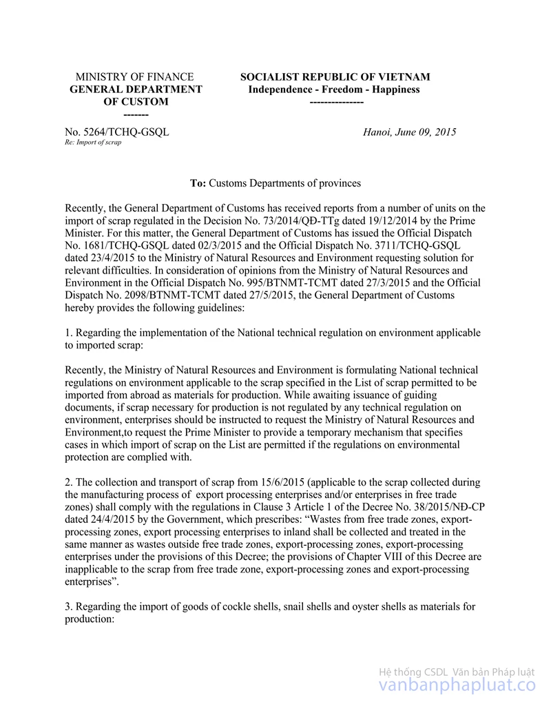 Nội dung toàn văn Công văn 5264/TCHQ-GSQL 2015 nhập khẩu phế liệu