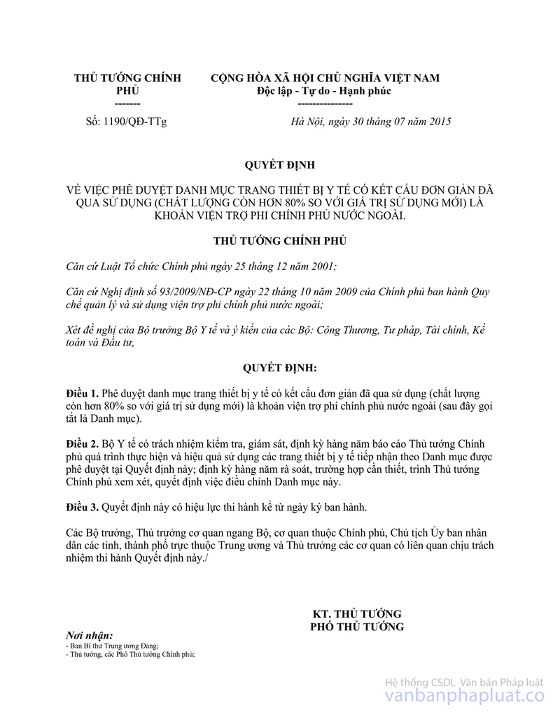 Ngày 30/7/2015, Thủ tướng Chính phủ ban hành Quyết định số 1190/QĐ-TTg phê duyệt Danh mục trang thiết bị y tế có kết cấu đơn giản đã qua sử dụng (chất lượng còn hơn 80% so với giá trị sử dụng mới) là khoản viện trợ phi chính phủ nước ngoài (sau đây gọi tắt là Danh mục). Thực hiện nhiệm vụ được quy định tại Quy chế quản lý và sử dụng viện trợ phi chính phủ nước ngoài ban hành kèm theo Nghị định số 93/2009/NĐ-CP của Chính phủ, Bộ Kế hoạch và Đầu tư hướng dẫn như sau:
