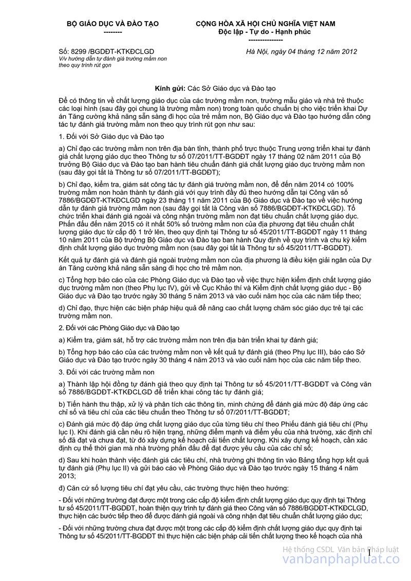 1. Thực hiện nghiêm túc Công văn số 8299/BGDĐT-KTKĐCLGD ngày 04/12/2012 của Bộ GDĐT về việc hướng dẫn tự đánh giá trường mầm non theo quy trình rút gọn. Đó là một trong những điều kiện để triển khai Dự án Tăng cường khả năng sẵn sàng đi học của trẻ mầm non (SRPP) theo cam kết của Chính phủ với Ngân hàng Thế giới.