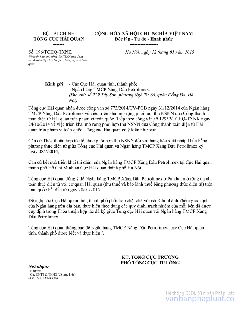 Tổng cục Hải quan nhận được công văn của các Ngân hàng thương mại cổ phần: Á Châu (ACB), Sài Gòn (SCB), An Bình (ABBank) và BTMU về việc báo cáo kết quả triển khai thí điểm chương trình thu hộ ngân sách nhà nước và đề xuất được triển khai mở rộng trên toàn quốc. Tiếp theo công văn số 196/TCHQ-TXNK ngày 12/01/2015 về việc triển khai mở rộng phối hợp thu ngân sách nhà nước qua Cổng thanh toán điện tử Hải quan trên phạm vi toàn quốc, Tổng cục Hải quan có ý kiến như sau: