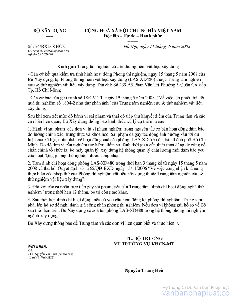 - Ngày 11/6/2008, Bộ Xây dựng đã có văn bản số 74/BXD-KHCN và 75/BXD-KHCN thông báo hình thức xử lý hai phòng thí nghiệm trên: thu hồi các quyết định công nhận; đình chỉ hoạt động thí nghiệm 3 tháng; yêu cầu chấn chỉnh tổ chức, hoạt động; lập lại hồ sơ đánh giá, công nhận lại phòng thí nghiệm; đình chỉ công tác thí nghiệm đối với các cá nhân vi phạm và bố trí công tác khác.