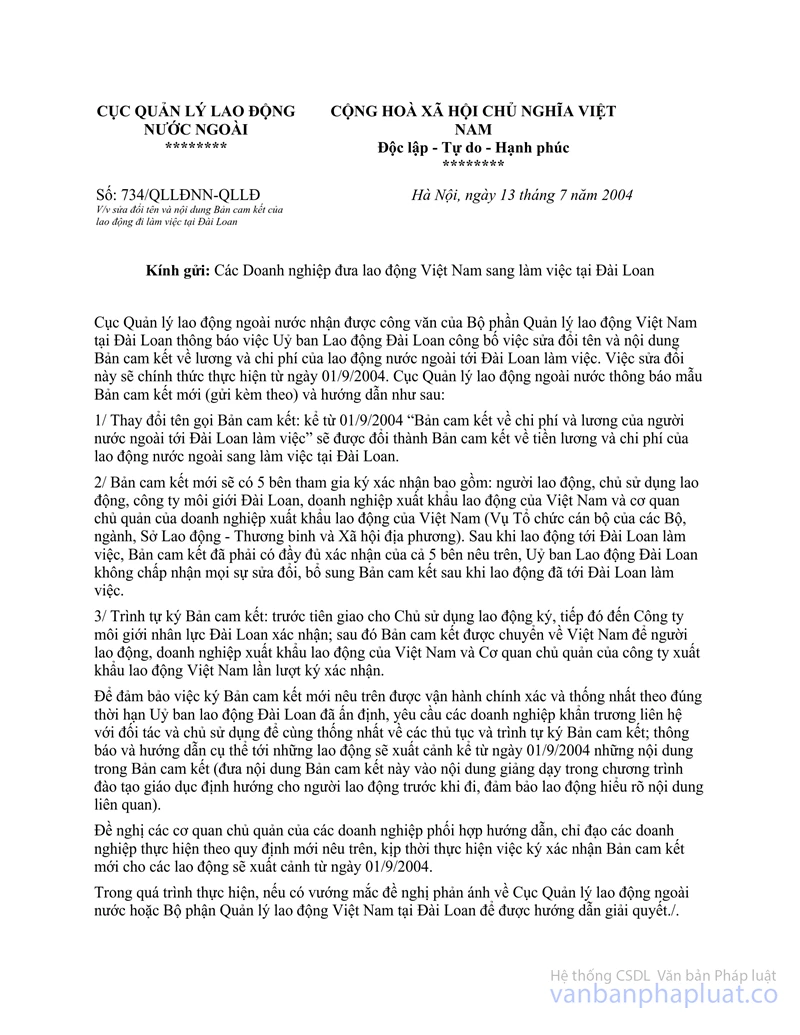 Cục Quản lý lao động nước ngoài nhận được công văn số 426/VPĐB-LĐ/2004 ngày 22/7/2004 Ban Quản lý lao động Việt Nam tại Đài Bắc thông báo việc UBLĐ Đài Loan ban hành Văn bản 0930205125 nêu rõ trình tự ký tên trong bản cam kết. Cục Quản lý lao động ngoài nước thông báo lại trình tự các bên ký tên trong Bản cam kết (Trình tự này có thay đổi so với trình tự thông báo tại Điểm 3 trong công văn số 734/QLLĐNN -QLLĐ ngày 13/7/2004 của Cục Quản lý lao động ngoài nước), cụ thể như sau: