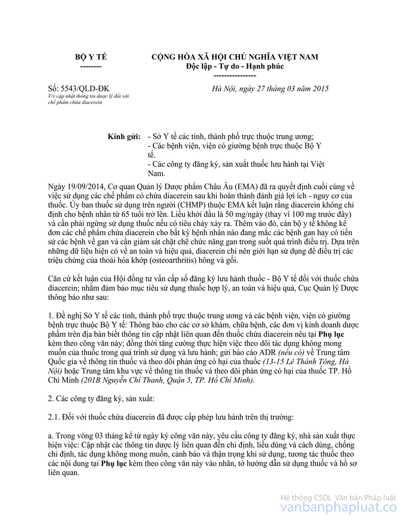 Công văn này thay thế Công văn số 5543/QLD-ĐK ngày 27/3/2015 của Cục Quản lý Dược về cập nhật thông tin dược lý đối với chế phẩm chứa diacerein.