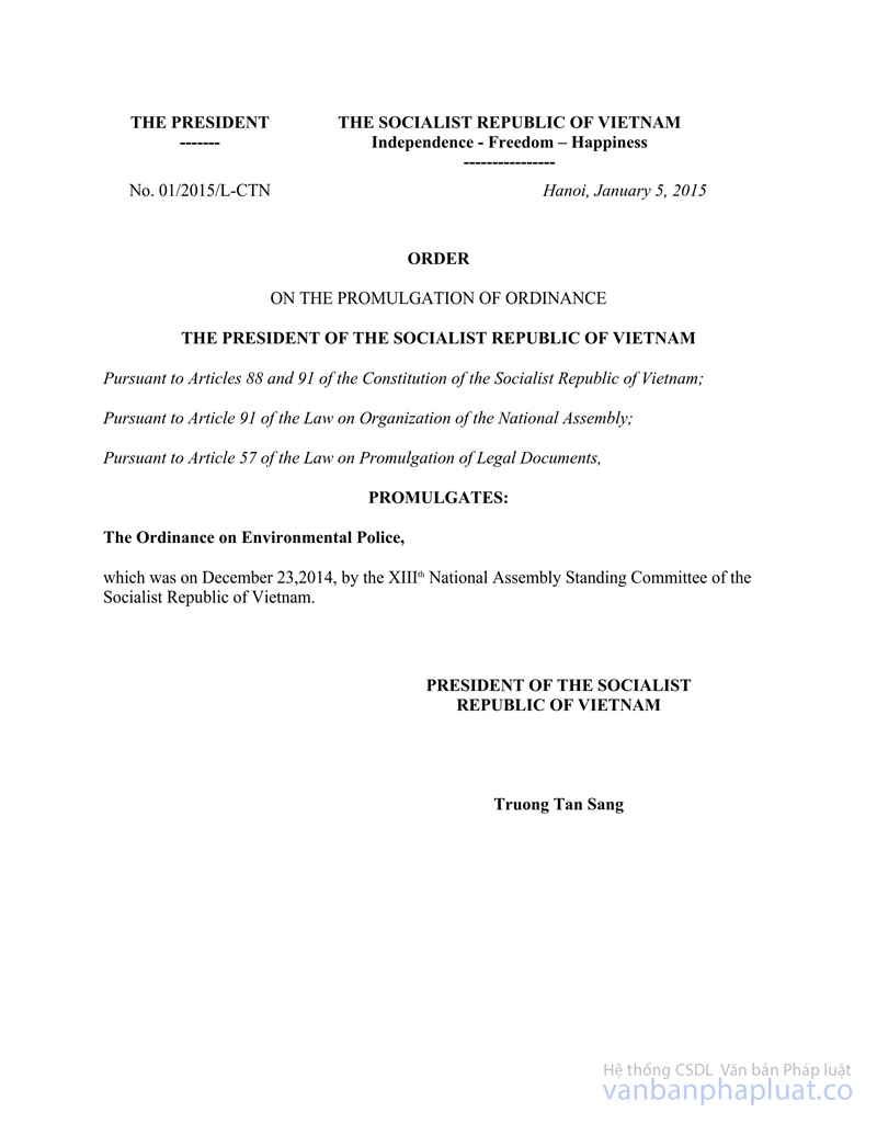 Nội dung toàn văn Lệnh công bố Pháp lệnh Cảnh sát môi trường năm 2014