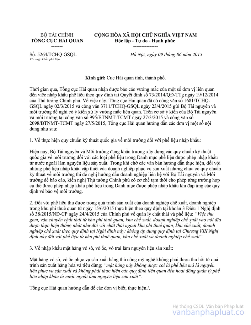 Nội dung toàn văn Official Dispatch No. 5264/TCHQ-GSQL 2015 Import of scrap
